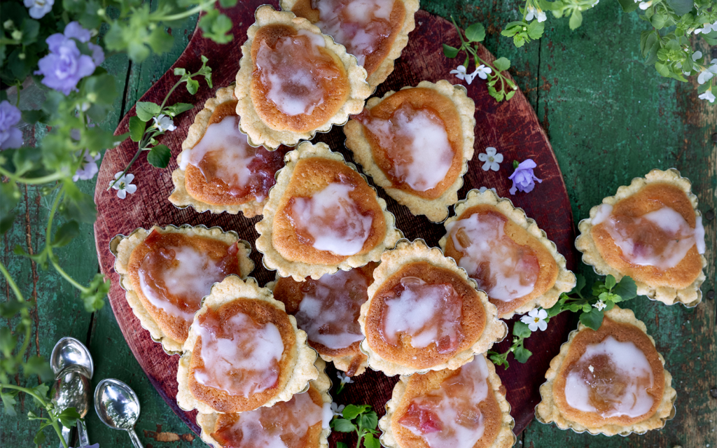 Lägg 1 tsk av rabarbersylten i varje form. Fördela mazarinsmeten ovanpå. Grädda mazarinerna på en plåt i mitten av ugnen i 200 grader i ca 15 minuter. Låt svalna.