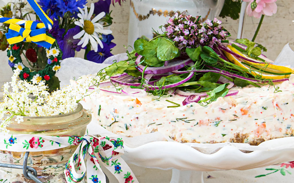 Garnera tårtan med rödlöksringar, citronskivor, ärtskott och örter.