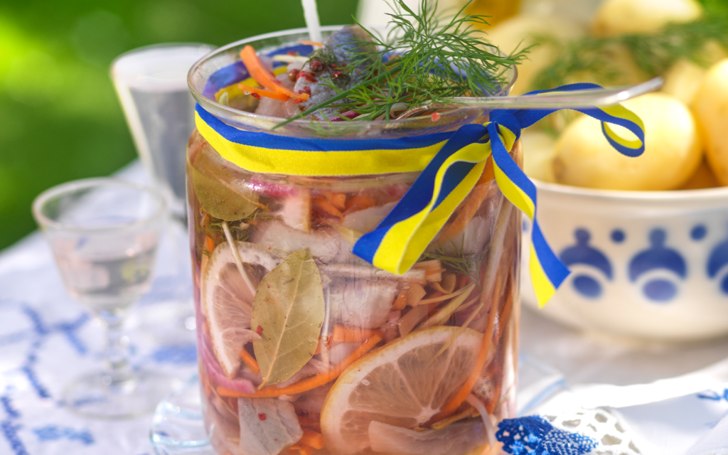 Varva sill och grönsaker i en skål eller burk. Häll på den kalla lagen. Toppa med dill.