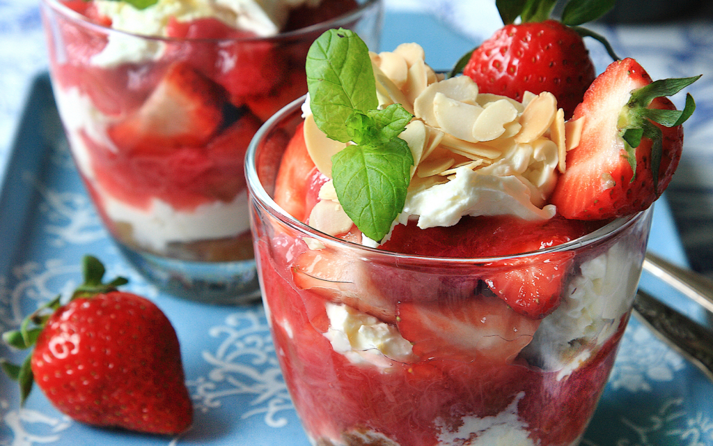Varva därefter rumsvarm ostkräm, rabarberkompott, jordgubbar och sockerkaka med likör på. Avsluta med ostkräm.