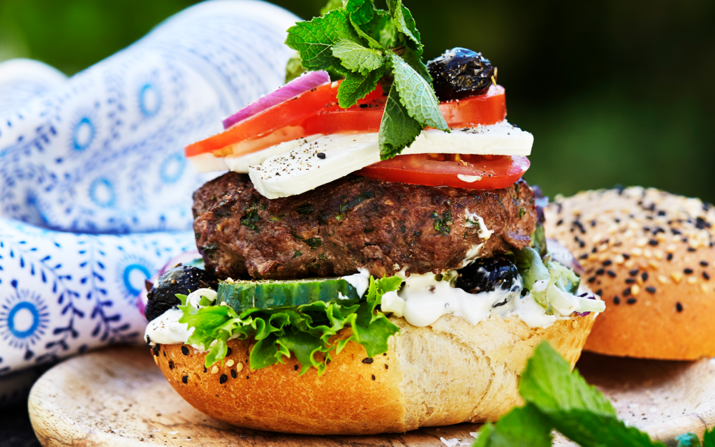 Bred yoghurtdressing på hamburgerbröden. Lägg ihop burgaren med sallad, gurka, fetaost, kött, tomat och oliver.