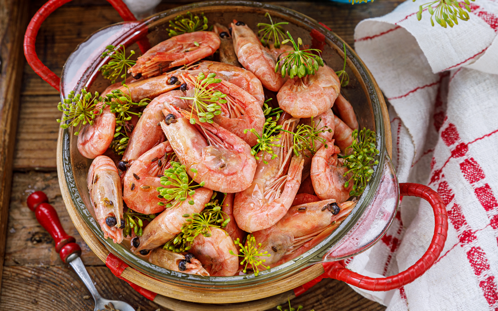Lägg upp räkorna i en skål och garnera med dillkronan plockad i små buketter.