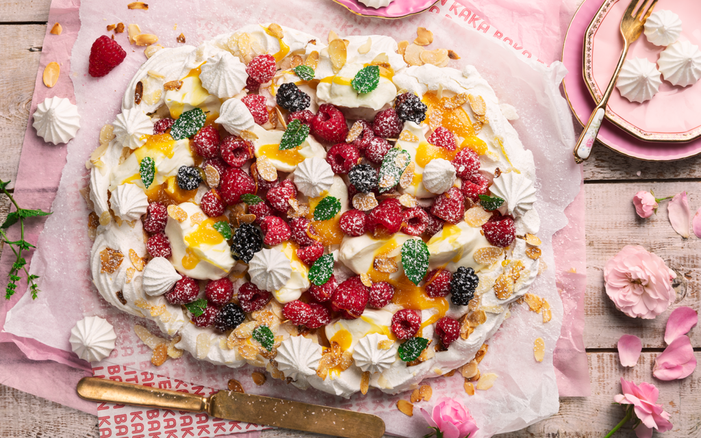 Garnera med mandelspån, hallon, björnbär och myntablad. Sikta över florsocker.