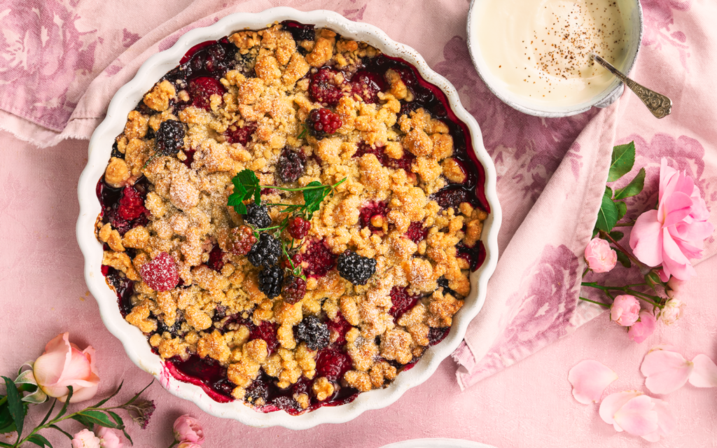 Smöra en pajform och häll i bären. Fördela smuldegen ovanpå.