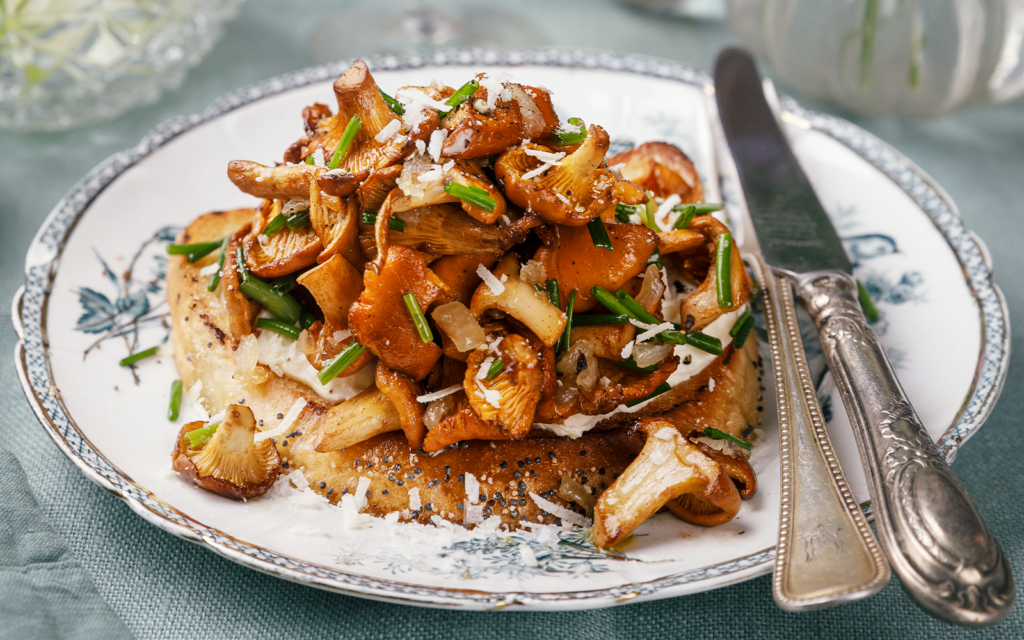 Bre färskosten på bröden och toppa med svampen. Ringla över smöret som finns kvar i pannan.