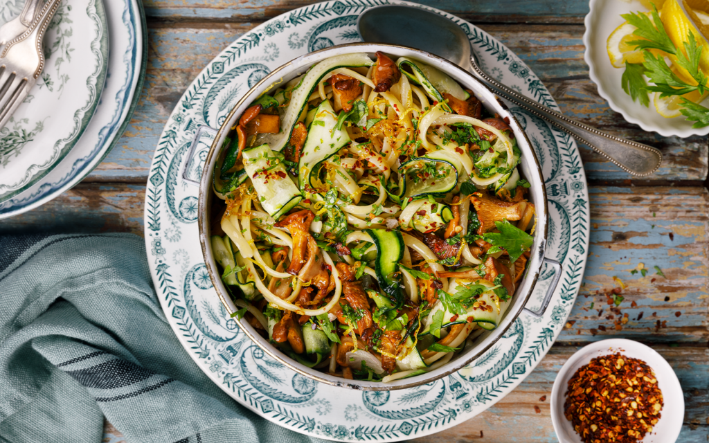 Fräs finhackad skinka, citronskal och vitlök i olivoljan 1–3 minuter. Vänd ner pastan med zuccinin och den frästa svampen, stek under omrörning tills allt blir genomvarmt, ca 3 minuter. Smaka av med salt. Blanda i persiljan och toppa med chiliflingor.