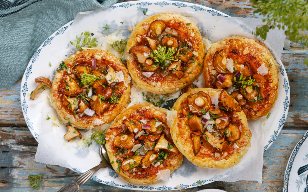 Sätt ugnen på 200°. Rulla ut smördegen med bakplåtspappret på en plåt. Ta ut runda pizzor med kakmått, ca 11 cm i diameter, ta bort överflödig deg (går att frysa och använda senare). Pensla rundlarna med uppvispat ägg.