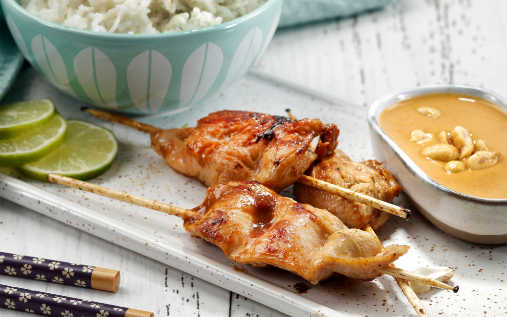Jordnötssås: Värm oljan i en liten kastrull och tillsätt currypastan. När currypastan har smält (var försiktig så att den inte bränns), tillsätt kokosmjölken och koka upp. Låt såsen sjuda i ca 10 minuter. Tillsätt jordnötssmör och jordnötter. Ställ kastrullen åt sidan och tillsätt socker och citronsaft.