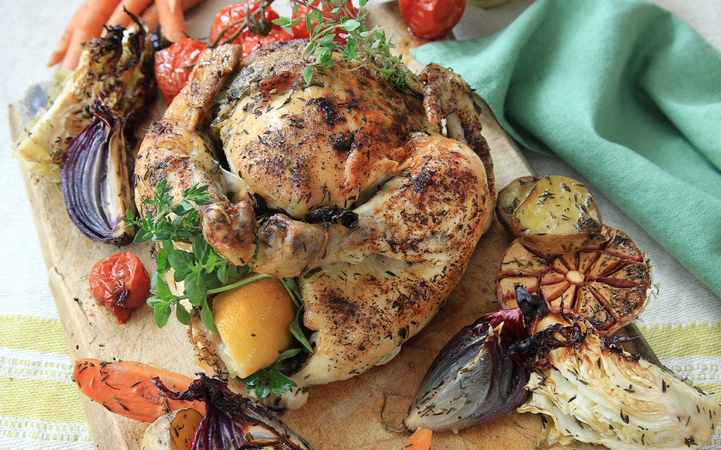 Stek mitt i ugnen i 175 grader tills grönsaker och potatis är mjuka och kycklingen precis genomstekt, ca 1 ½ timme. Kycklingen ska vara 82° vid lårbenet. Höj ev ugnstemperaturen i slutet av stektiden.