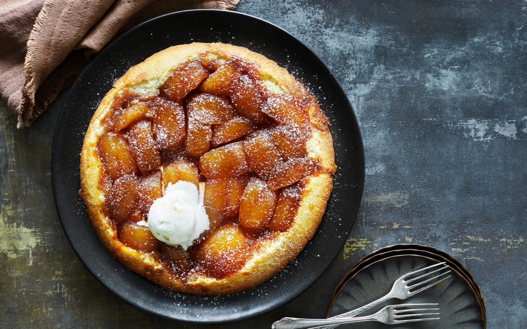Servering: Vänd försiktigt men snabbt ut pajen på ett serveringsfat så att äpplena kommer uppåt. Servera pajen ljummen med vaniljglass.