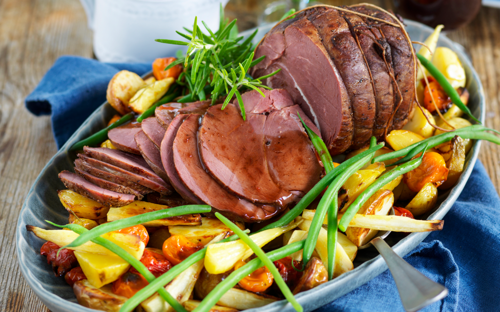 Fördela de rostade rotfrukterna på ett uppläggningsfat. Skiva köttet och lägg ovanpå. Toppa med bönorna och lite rosmarin.