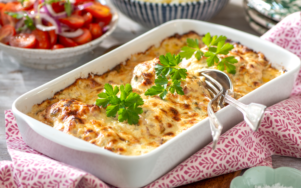 Gratinera i ugnen i cirka 30 minuter tills kycklingen är klar.