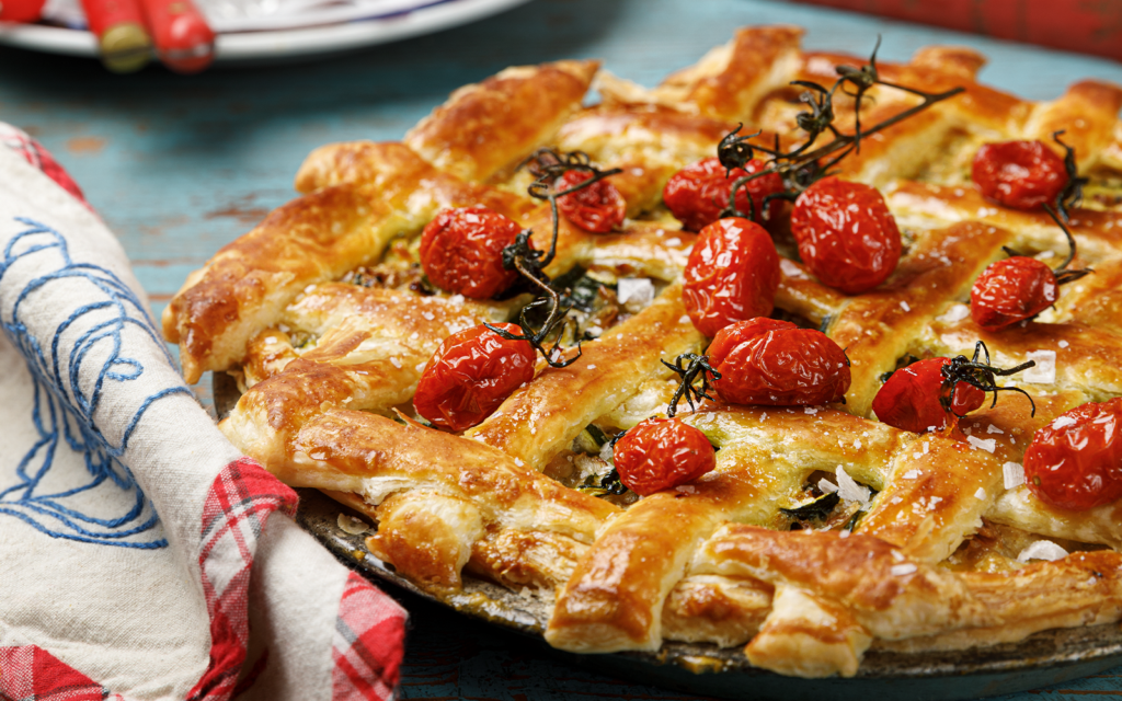 Garnering: Lägg remsorna som ett galler över pajen (du kan också göra pajen utan galler). Pensla gallret med gulan blandad med vatten. Smula över flingsalt. Grädda pajen i mitten av ugnen ca 45 minuter. Toppa med tomater.