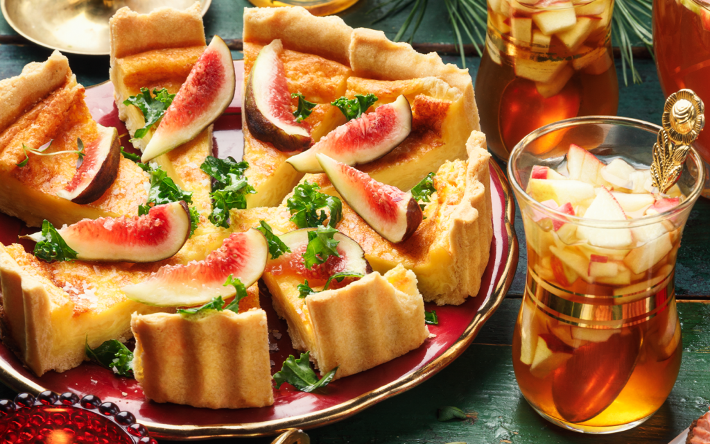 Servering: Skär pajen i snibbar. Skär fikon i smala klyftor. Blanda kålen med oljan. Fördela garneringen över pajen.
