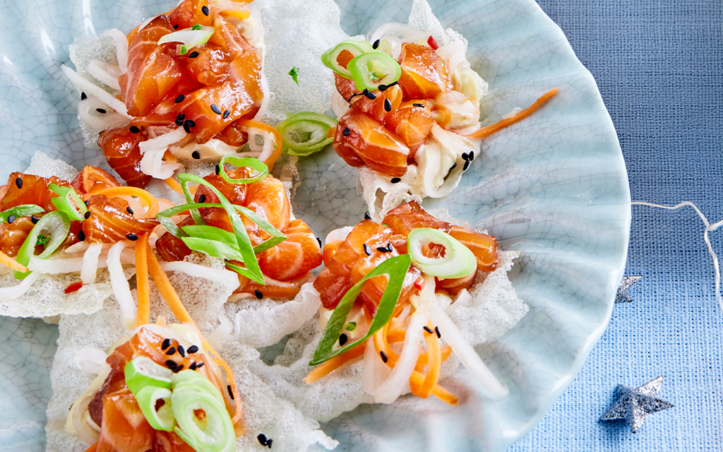 Lägg ut bitar av friterat rispapper på ett fat och klicka på majonnäs. Toppa med grönsaker och lax samt sesamfrön.