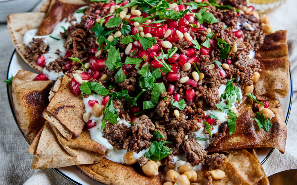 Servering: Fördela de stekta brödbitarna på ett fat. Skeda över kikärtorna och vätskan. Toppa med yoghurtsåsen och den stekta färsen. Garnera med granatäpplekärnor, pinjenötter och hackad persilja.