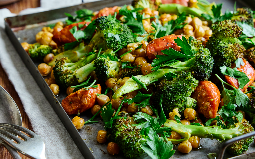 Fördela ut kikärtor, korv och broccoli på en ugnsplåt, ringla över olivolja, krydda med lite salt och peppar och blanda.