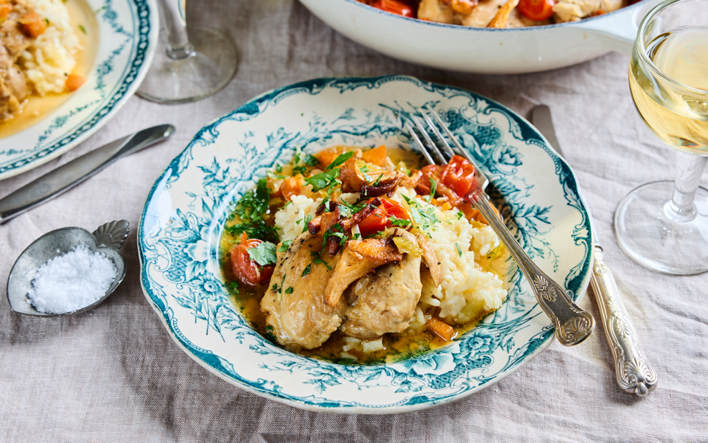 Tillsätt vitt vin och låt det få ett uppkok. Tillsätt kycklingen, tomater, lagerblad och rosmarin och låt grytan sjuda på låg värme under lock i ca 30 minuter tills kycklingen är genomstekt, tillsätt lite vatten om det behövs.