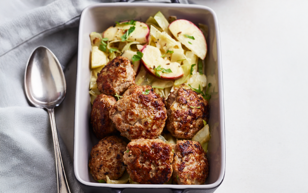 Hetta upp resten av smöret i en stekpanna. Fräs kålen med löken och äpplet tills allt mjuknat och fått fin färg.