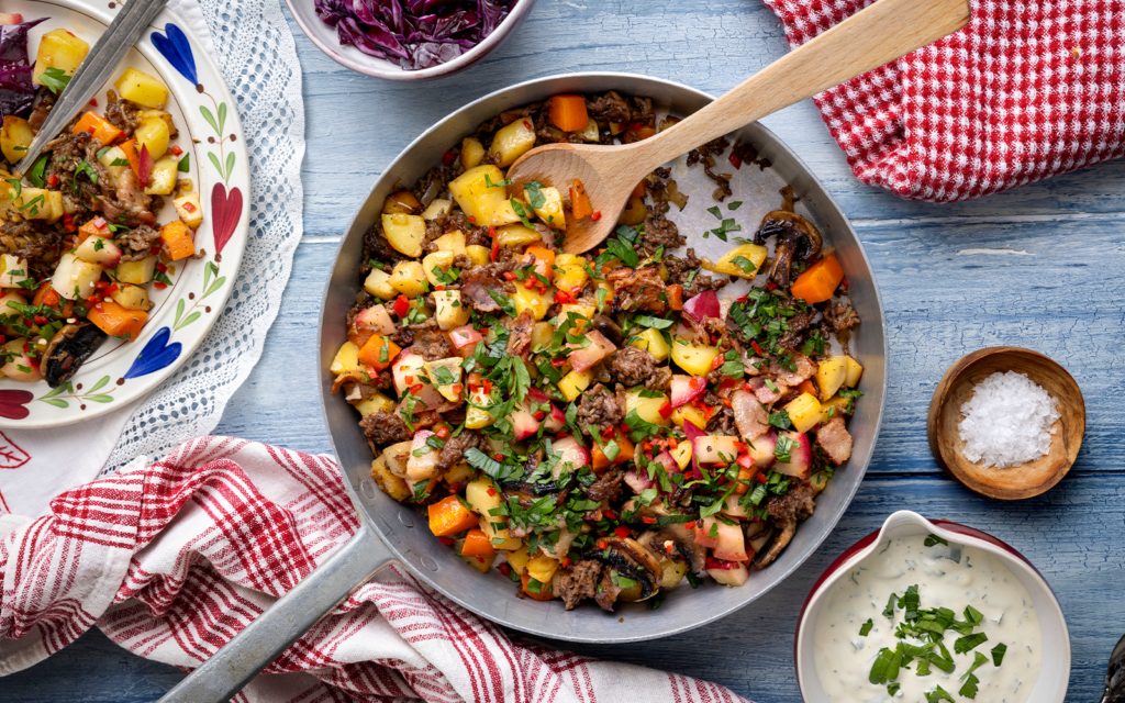 När det återstår 5 minuter på rotfrukterna, tillsätt lök, chilifrukt, äpple, champinjoner och bacon. Rör om, stek alltsammans i ugnen den återstående tiden. Ta ut och rör ner köttfärsen och strö över bladpersilja.