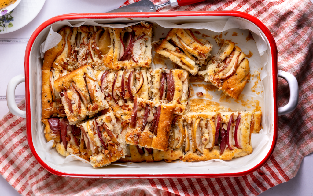 Kärna ur äpplena och dela dem i tunna klyftor (skalet kan vara kvar). Hacka sötmandeln grovt. Stick i äppelskivorna i smeten och strö över sötmandeln.