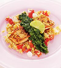 Grillad lax med vitlöksspenat och bulgur