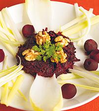 Rödbetsplätt med endiv, körvel, valnötter och purjolök