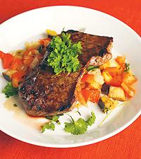 Grillad köttbit med vitlöksdoftande grönsaksragu