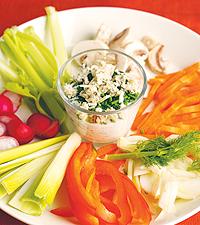Knapriga grönsaker, ädelostdipp, bröd och het buljong