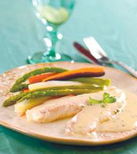 Gös i vitvinssås med sparris- och morotsstänger