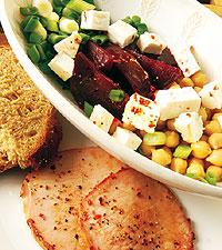 Kokta rödbetor med fetaost och grillad kassler