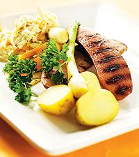 Grillad korv med cole slaw, nykokt färskpotatis och salladslök
