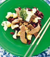 Lövbiff med blomkål och bönor