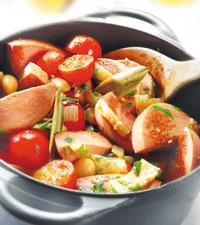Falukorvsgryta med öl och tomat