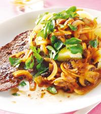 Lövbiff med lök- och svampröra
