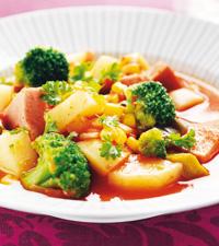 Falukorvsgryta med majs och broccoli