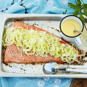 Lax i ugn med hollandaise och syrad fänkålssallad