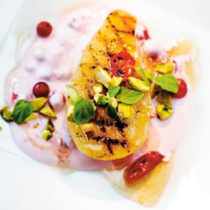 Inkokta, grillade päron med rödvinbärskesella