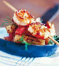 Senapsglaserade polkabetor med halstrade stora räkor
