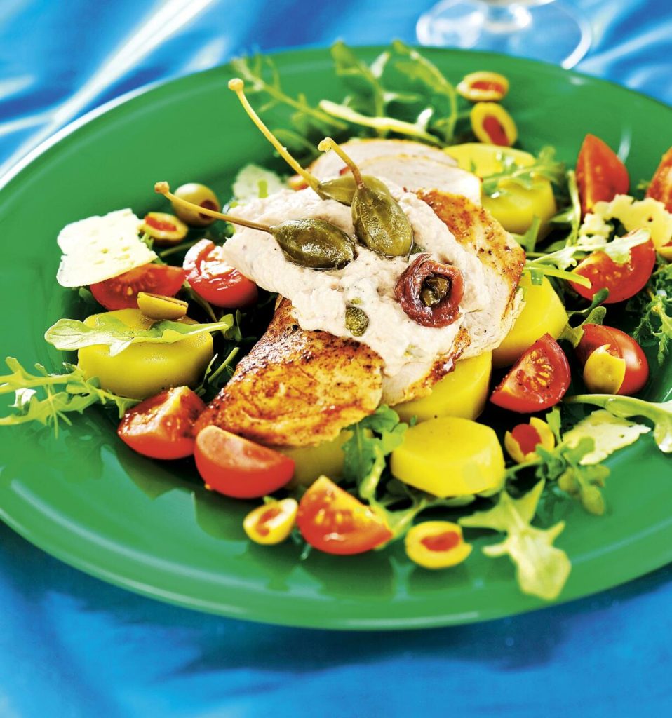 Stekta kycklingbröst med tonfisksås och potatissallad