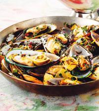 Ugnsbakade grönskalsmusslor med chilispetsad hollandaisesås