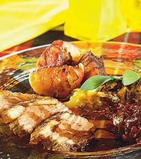Vildsvinskotletter på rotsaks-, svamp- och lökbädd