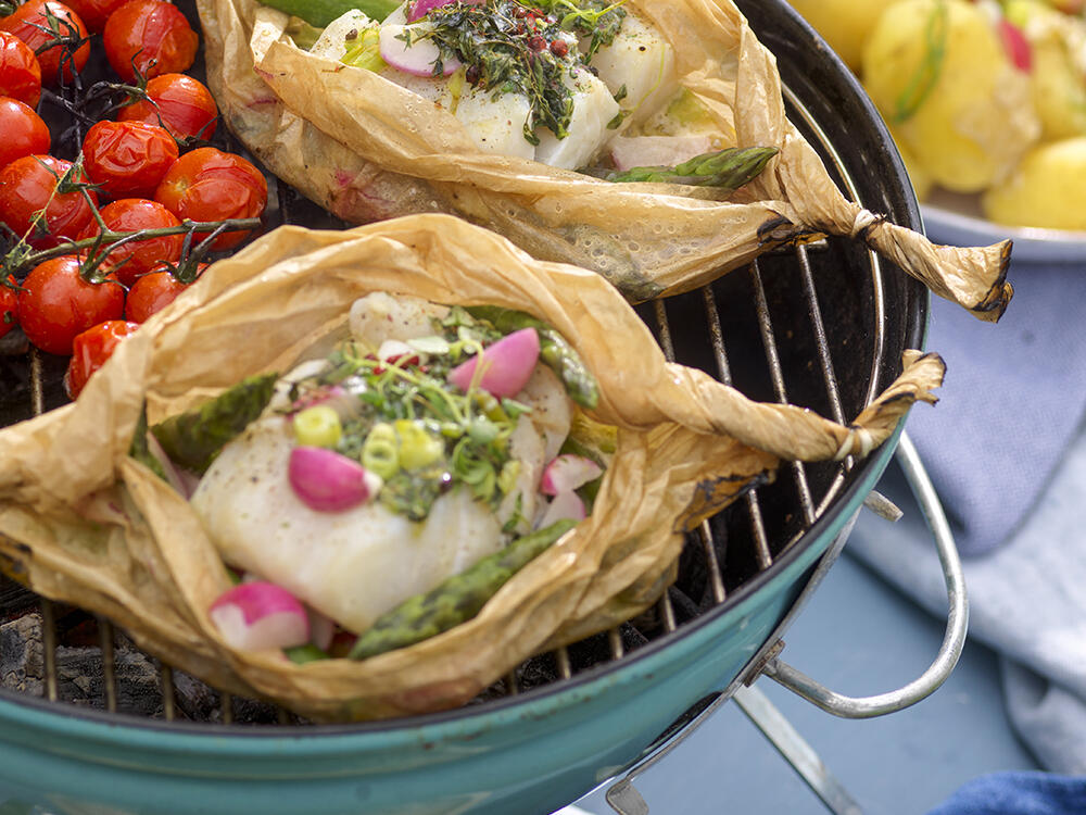 Fiskpaket med örtsmör och primörer