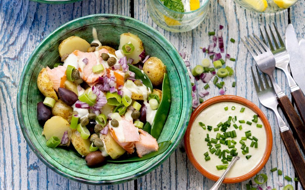 Färskpotatissallad med varmrökt lax