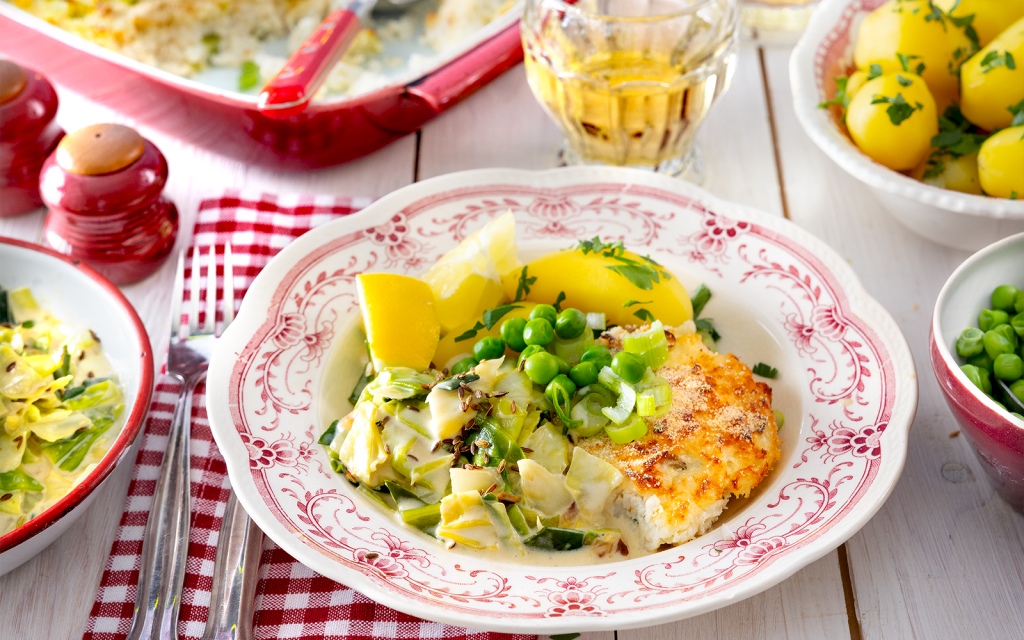 Piggvar i ugn med vitvinssås