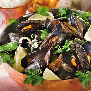 Vinångade musslor med pommes frites
