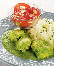 Kyckling i grön ärtsås med tomat- och mandelsallad