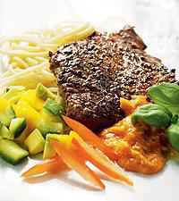 Lukas entrecote med tomatsås, sallad och pasta