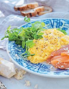Äggröra med rökt lax med pepparrot och vattenkrasse