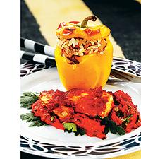 Fylld paprika och kycklingfiléer i paprikasås